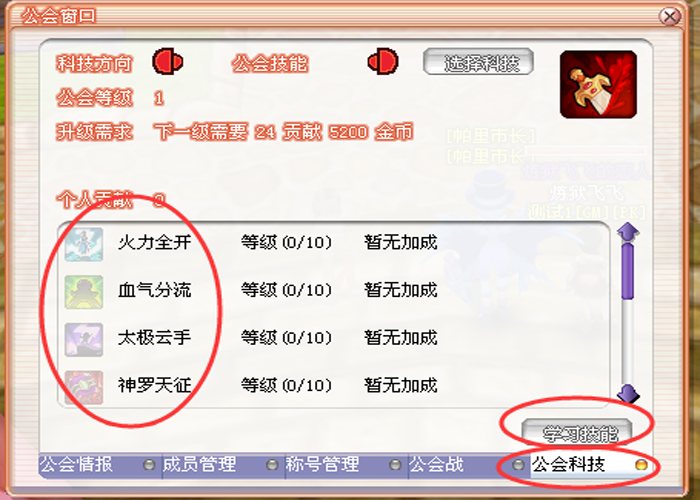 - 2.公会技能玩家可通过消耗自身的贡献和游戏币进行提升技能等级